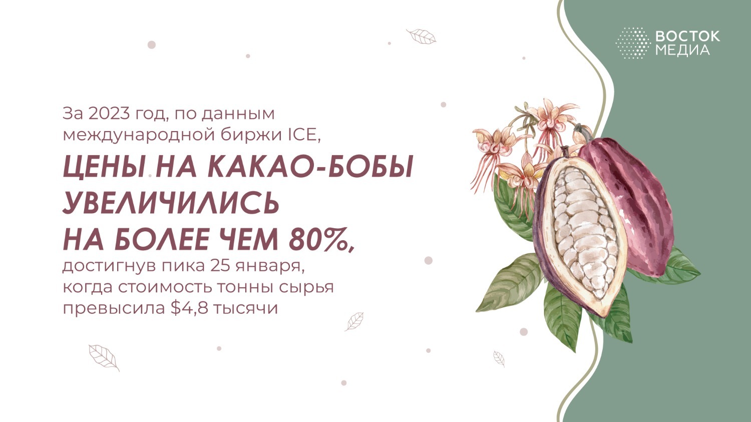 «Резкий рост мировых цен на какао связан с сохраняющимся дефицитом этой продукции на мировом рынке и увеличением расходов на её транспортировку. В этих условиях по итогам 2024 года котировки могут вырасти ещё на 25—30%», — рассказал федеральным журналистам аналитик Freedom Finance Global Владимир Чернов.Исполнительный директор Ассоциации предприятий кондитерской промышленности «АСКОНД» Вячеслав Лашманкин рассказывал, что сегодня погода африканского континента взяла власть над промышленностью.