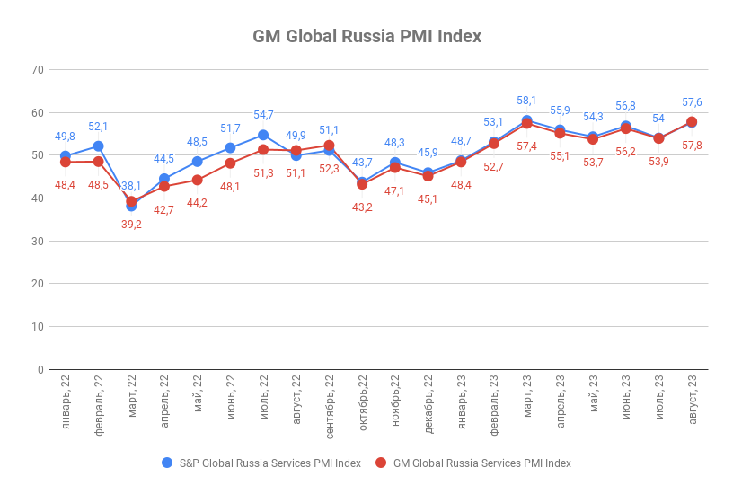 Августовское значение индекса деловой активности ГлобалМедиа PMI (GM Global Services Russia PMI Index) составило 57,8 п.п. против 53,9 п.п. в июле. Значение индекса деловой активности в сфере услуг от S&P Global (Global Russia Services PMI by the S&P Global) за аналогичный период выросло с 54 п.п. до 57,6 п.п.