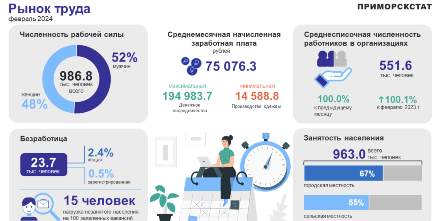По данным статистического ведомства, в организациях Приморья трудятся 551,6 тыс. человек. И безработица находится на уровне 2,4%.