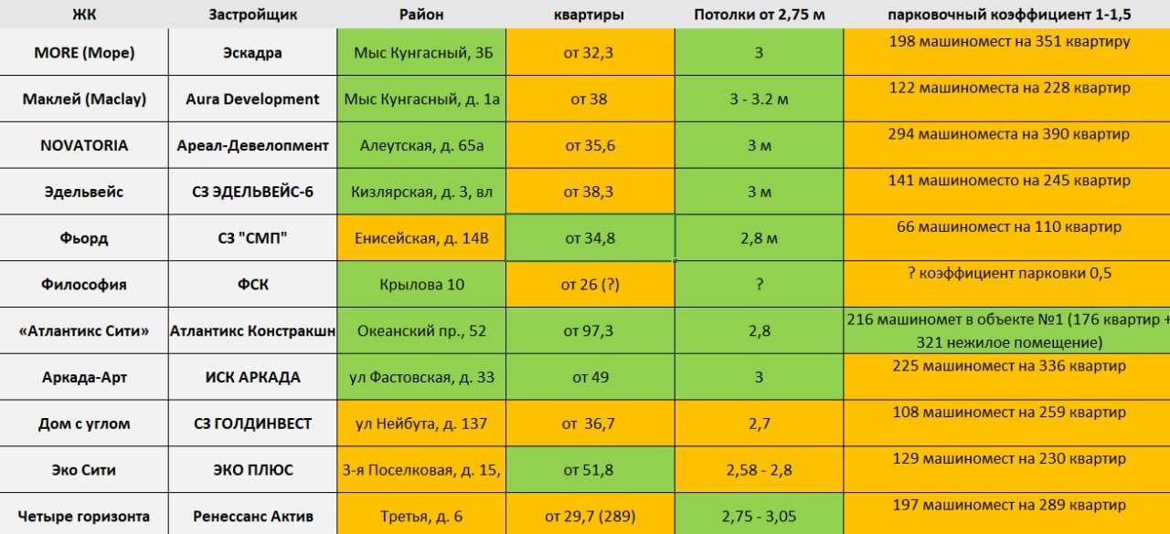 ТГ-канал "Вся недвижимость Владивостока" проанализировал ЖК Владивостока и таких параметров почти не нашел (см. таблицу, зелёный – соответствует, жёлтый – не соответствует).