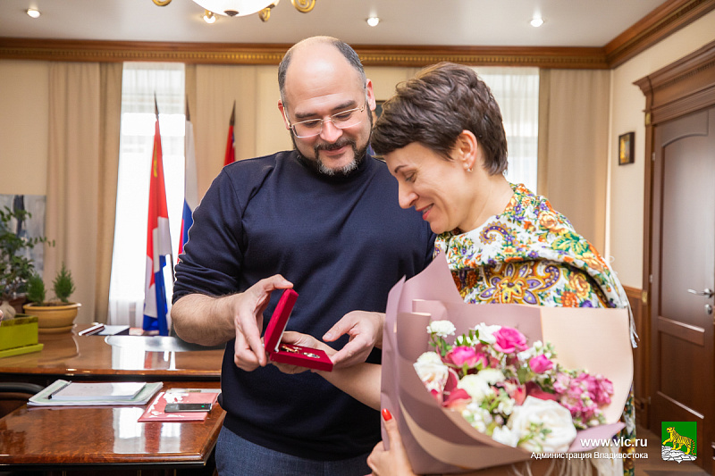 Константин Шестаков вручил Юлии знак отличия «Владивосток – город воинской славы», которым награждают в том числе за спасение людей, а также букет цветов.