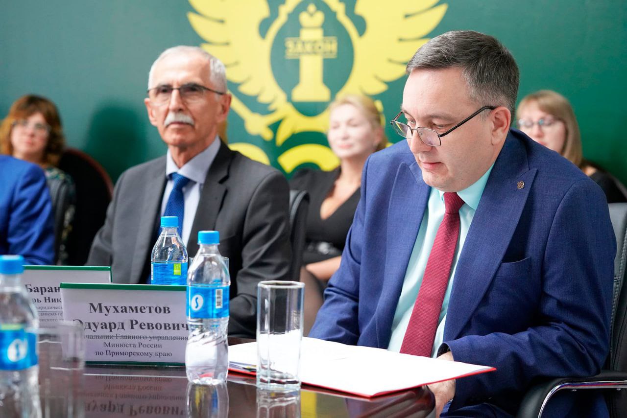 Обращаясь к присутствующим с приветственным словом, начальник Главного управления Минюста России по Приморскому краю Эдуард Мухаметов отметил: «История образования органов юстиции в Приморском крае тесно связана с историей органов юстиции России. Главное управление Минюста России по Приморскому краю сегодня решает задачи по обеспечению единства правового пространства Российской Федерации на территории края, регистрации и контроля деятельности некоммерческих организаций, контроля и надзора в сфере адвокатуры, нотариата, органов ЗАГС, координации деятельности территориальных органов, подведомственных Минюсту России служб и учреждений, контроля за деятельностью территориальных управлений Дальневосточного федерального округа».