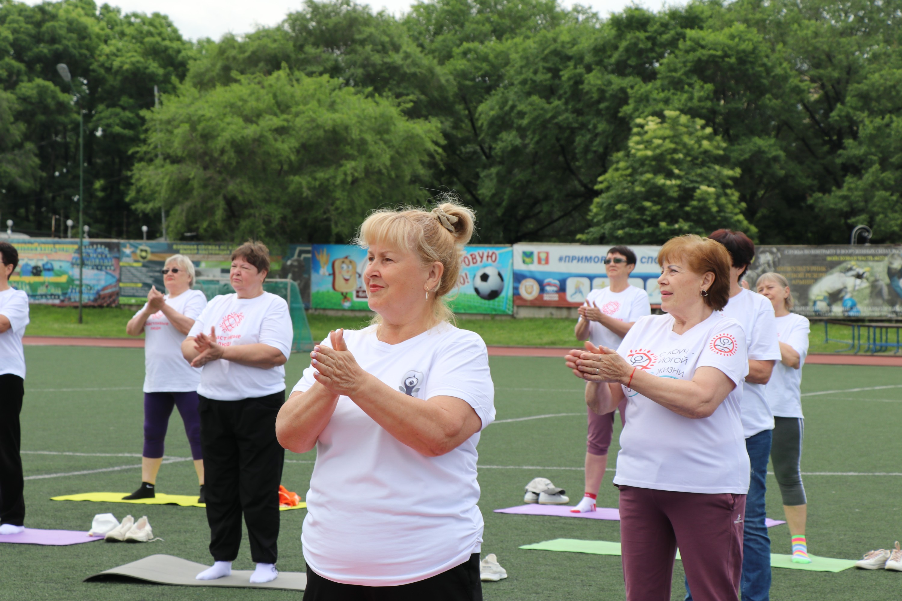 Ранним утром на Городском стадионе День России отметили самые активные уссурийцы – в торжественной обстановке им вручили знаки отличия ГТО. В общей сложности 20 жителей округа в возрасте от 56 до 75 лет получили заслуженные спортивные награды.