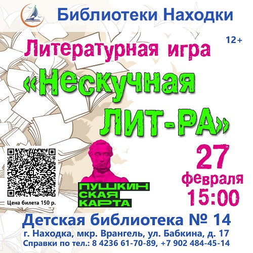 Литературная игра «Нескучная Лит-ра» пройдёт 27 февраля в 15.00 в детской библиотеке №14 по адресу: мкр. Врангель, ул. Бабкина, 17. Мероприятие предназначено для участников возрастной категории 12+.
