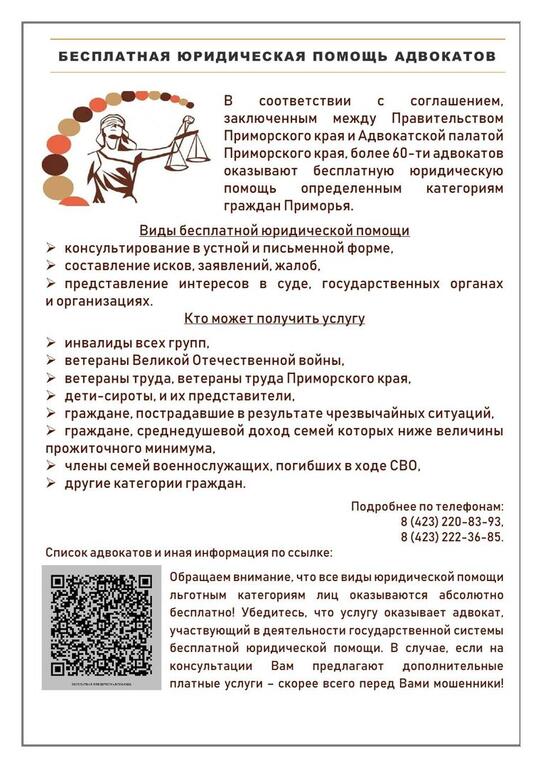 Со списком адвокатов и иной информацией о бесплатной юридической помощи можно ознакомиться на сайте департамента по координации правоохранительной деятельности Приморского края в разделе «Бесплатная юридическая помощь» по ссылке https://primorsky.ru/authorities/executive-agencies/departments/law/free-legal-aid.php , а также на сайте Адвокатской палаты Приморского края. Кроме того всю интересующую информацию можно получить по телефонам: 8 (423) 220-83-93, 8 (423) 222-3685.