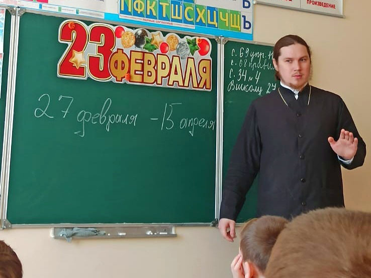 22 февраля иерей Димитрий Овчинников провел очередное занятие для учащихся второго класса казачьей направленности МОБУ «СОШ №10», воспитанников Даубихинской станицы.