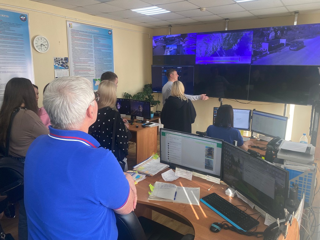 Оперативно-дежурная смена ЕДДС рассказала ребятам о системе видеонаблюдения АПК «Безопасный город». В городе установлено более 900 камер видеонаблюдения, которые охватывают детские площадки, места общего пользования и отдыха, скверы, прогулочные зоны, территории памятников, школ, дорожную сеть города и многие другие объекты. Молодые люди посмотрели, что происходит на этих площадках в режиме реального времени, увидели сами себя по дороге на экскурсию.