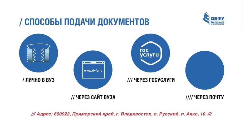 Способы подачи документов для всех категорий абитуриентов не изменились. Это можно сделать лично по адресу приемной комиссии (г. Владивосток, о. Русский, кампус ДВФУ, корпус А), через личный кабинет абитуриента на сайте вуза (раздел появится 20 июня), а поступающим на программы бакалавриата/специалитета — дополнительно посредством Единого портала «Госуслуги».