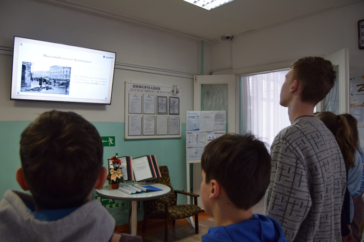 В холле школе искусств был организован просмотр видеоматериалов о блокаде. Учащиеся увидели фото- и кинохронику тех далеких дней.