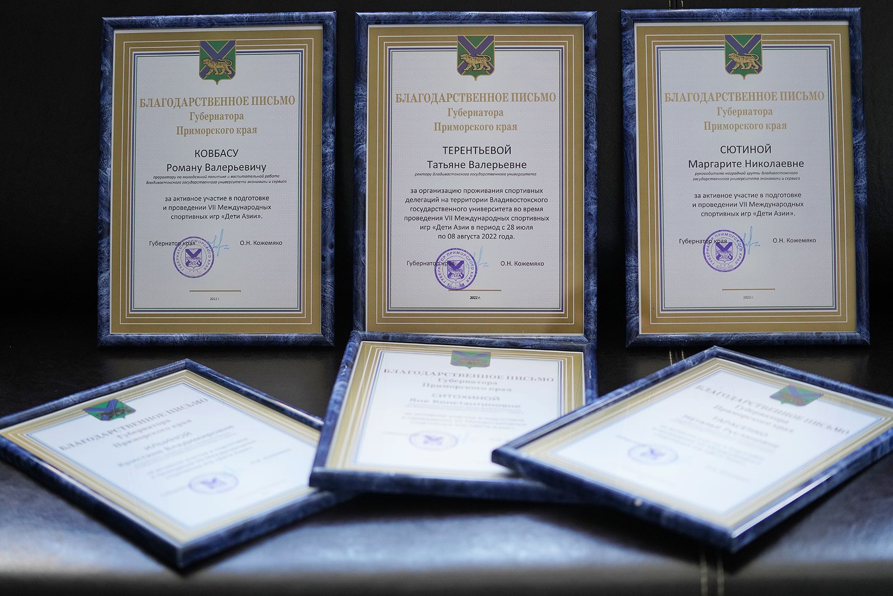 За активное участие в подготовке и проведении Благодарности главы региона VII международных спортивных игр «Дети Азии» благодарности главы региона удостоены и другие представители ВВГУ. В том числе, проректор по молодежной политике Роман Ковбас и директор Центра волонтёров Маргарита Сютина.