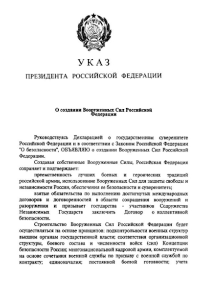 7 мая 1992 года Президентом Российской Федерации Борисом Ельциным был подписан указ «О создании Вооруженных Сил Российской Федерации»,