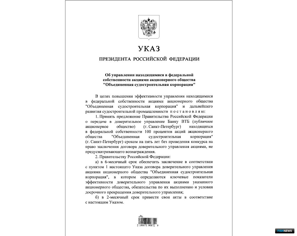 Президент подписал указ о передаче в доверительное управление Банку ВТБ госпакета акций Объединенной судостроительной корпорации.