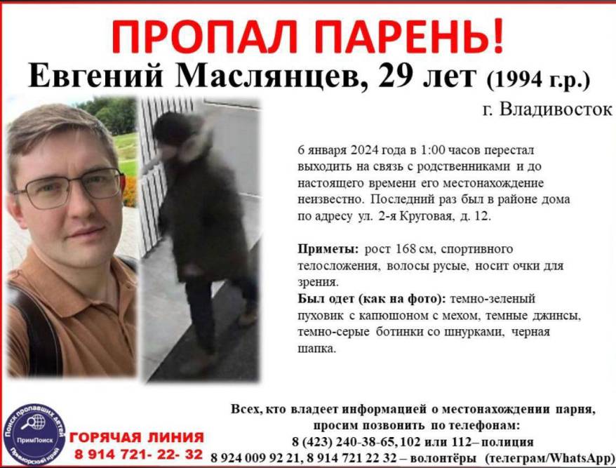 Ночью 6 января пропал хирург медцентра ДВФУ Евгений Маслянцев, 29 лет (1994 год рождения), житель Владивостока, сообщают "Вести:Приморье" со ссылкой на аккаунт "ПримПоиск" и владивостокские телеграм-каналы.