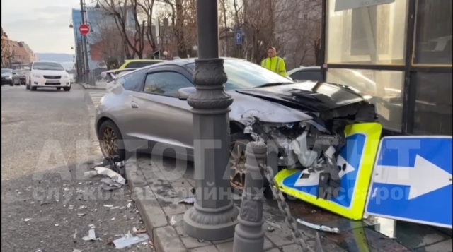 В центре Владивостока спорткар на полной скорости вылетел на тротуар — видео
