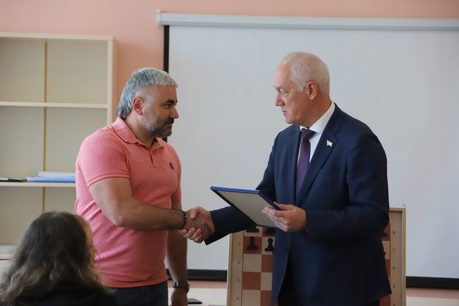 Председатель Думы города Владивостока Андрей Брик вручил директору ООО «Энергостройвосток» Артуру Нурмамедову Благодарность за оказание содействия в организации шахматного класса.