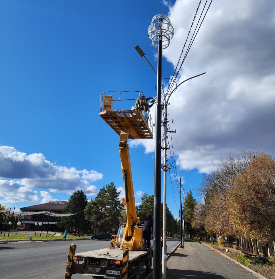 Замена трех опор уличного освещения с установкой на них элементов праздничной иллюминации идет на участке улицы Ломоносова от ул. Калининской до ул. Ленинской.