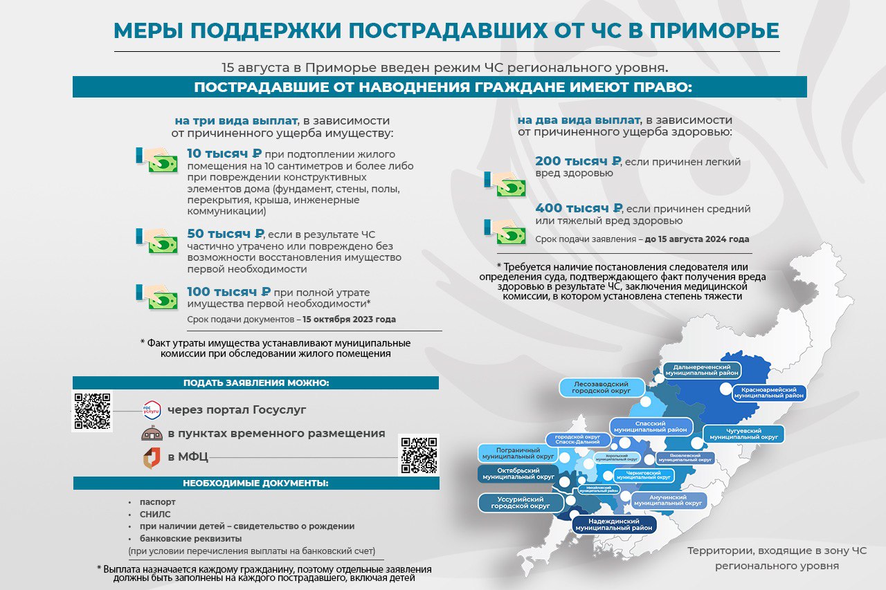 Срок обращения за выплатой – год с даты введения режима ЧС регионального характера на территории Приморского края. Режим ЧС ввели 15 августа, таким образом, граждане могут обратиться с заявлением до 15 августа 2024 года.