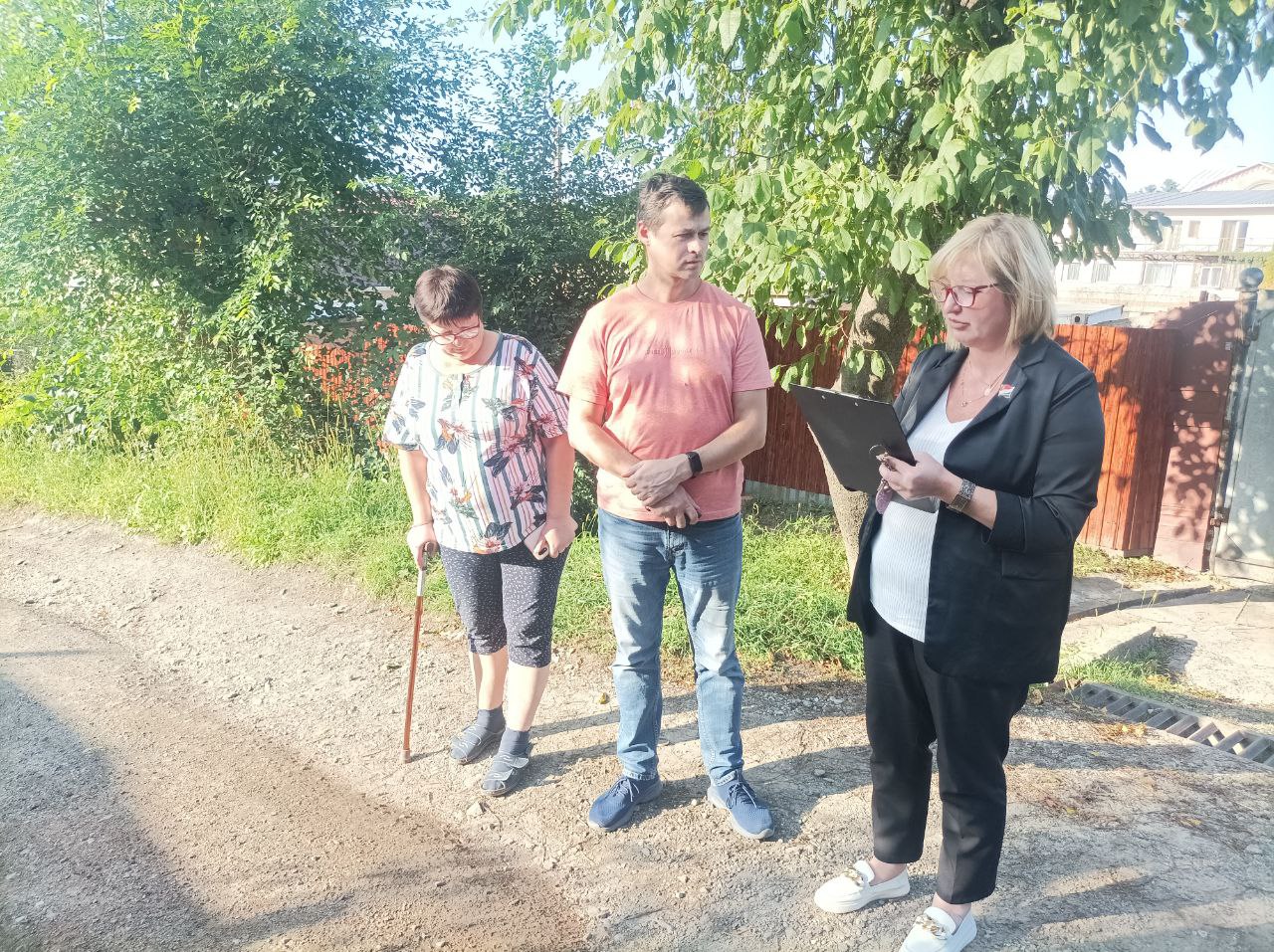 Обращение о том, что проезжая часть улицы нуждается в выполнении дорожных работ, поступило после сильных дождей. Дорога оказалась размыта в нескольких местах, требуется устройство кюветов и подсыпка. Мира Владимировна провела встречу и осмотрела все проблемные участки улицы, выслушала просьбы жителей улицы. Рельеф местности предполагает сток воды от дома №174 до дома №101.