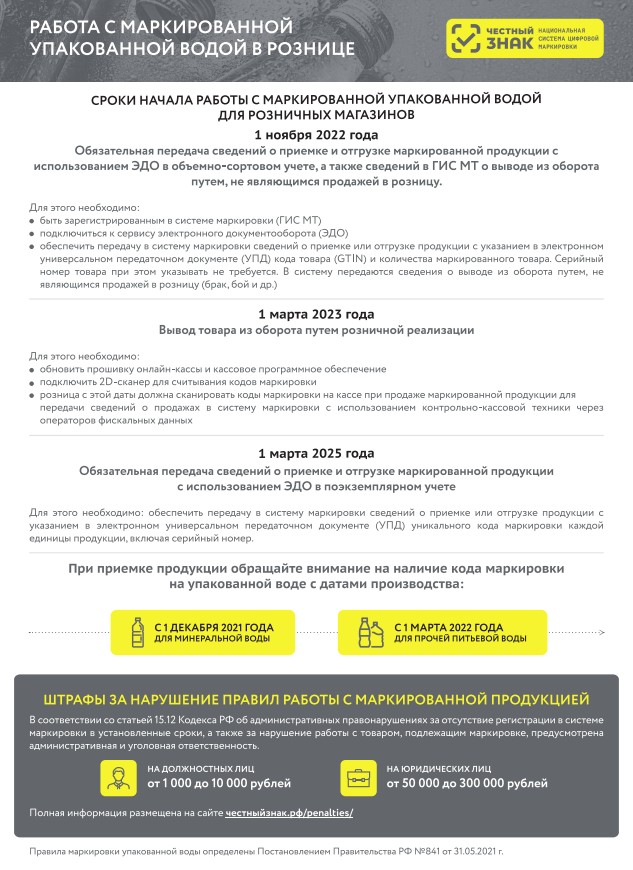 Информируем, что в соответствии с постановлением Правительства Российской Федерации от 31 мая 2021 г. № 841 «Об утверждении Правил маркировки упакованной воды средствами идентификации и особенностях внедрения государственной информационной системы мониторинга за оборотом товаров, подлежащих обязательной маркировке средствами идентификации, в отношении упакованной воды» (далее – Постановление, информационная система маркировки) с 1 ноября 2022 г. вступили в силу требования о передаче с помощью электронного документооборота (далее – ЭДО) в информационную систему маркировки сведений об обороте продукции с указанием в электронном универсальном передаточном документе (эУПД) кода товара (GTIN) и количества маркированного товара. Также в информационную систему маркировки с указанной даты необходимо направлять сведения о выводе из оборота упакованной воды путем, не являющимся продажей в розницу (брак, бой, отгрузка не участнику оборота, использование для собственных нужд и др.)