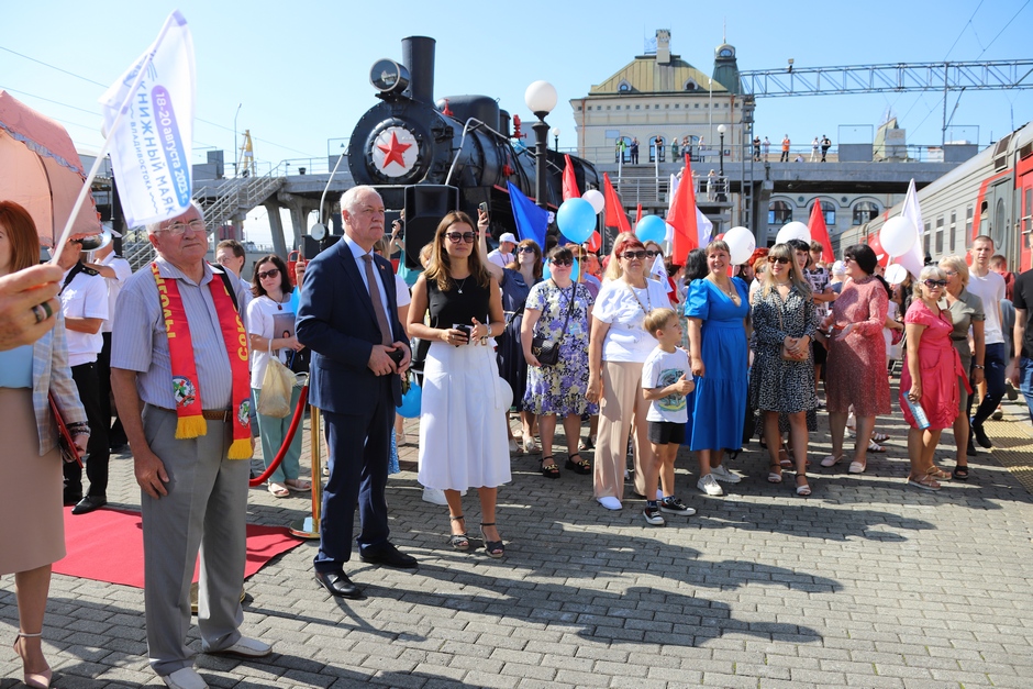 На перроне железнодорожного вокзала состоялась торжественная встреча прибывших на поезде из Санкт-Петербурга участников фестивале «Книжный маяк Владивостока».