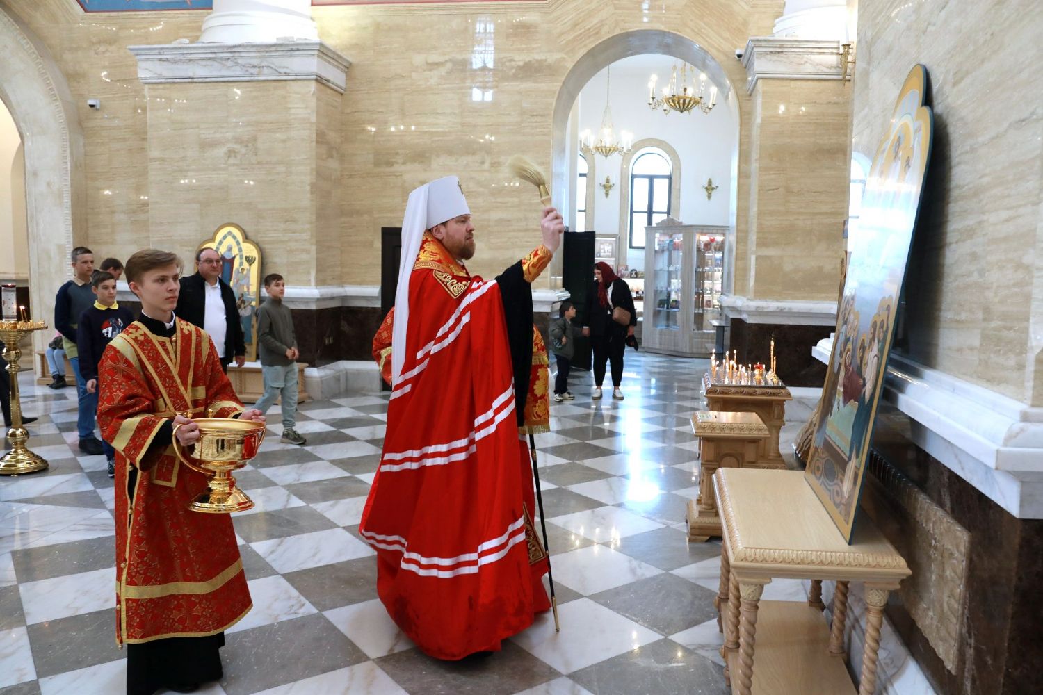 Архипастырь вознес молитву ко Господу о благословении и освящении Порт-Артурской иконы Торжества Пресвятой Богородицы, икон Пресвятой Богородицы «Всех скорбящих Радость» и Успения Божией Матери, образов святителя Николая чудотворца, святой благоверной княгини Анны Кашинской, святых мучениц Веры, Надежды, Любови и матери их Софии, и затем окропил их святой водой.