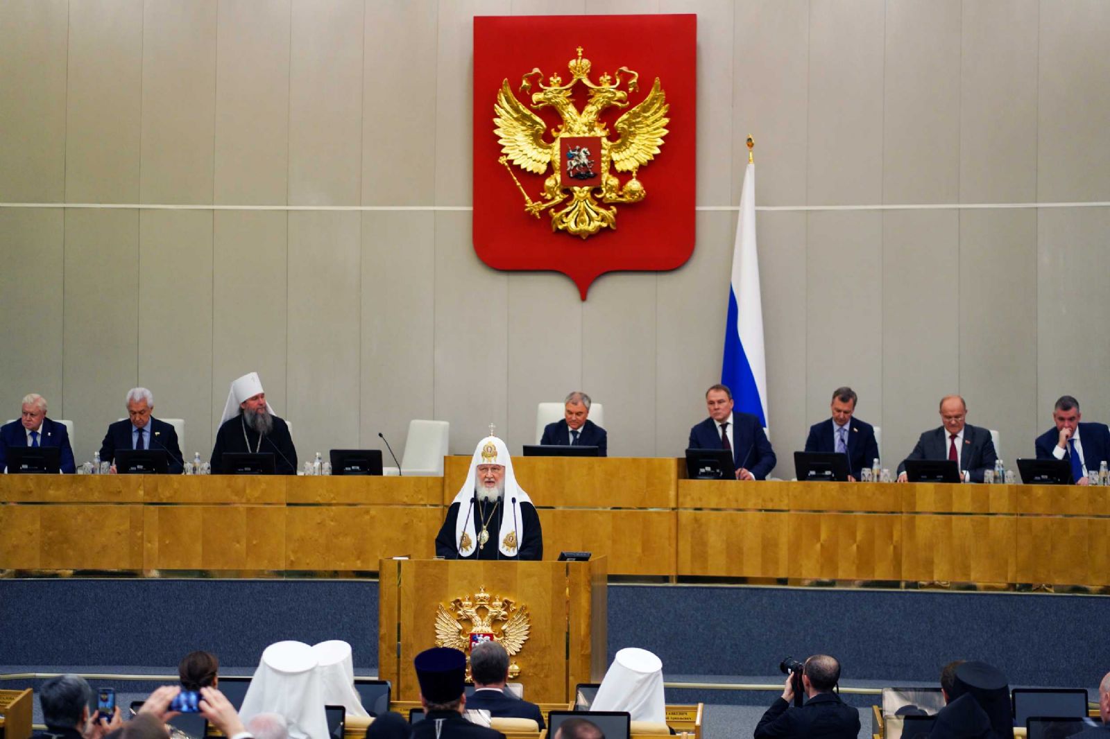 Святейший Патриарх Кирилл, В.В. Володин и митрополит Евгений прошли в зал заседаний Государственной Думы и заняли места в президиуме.