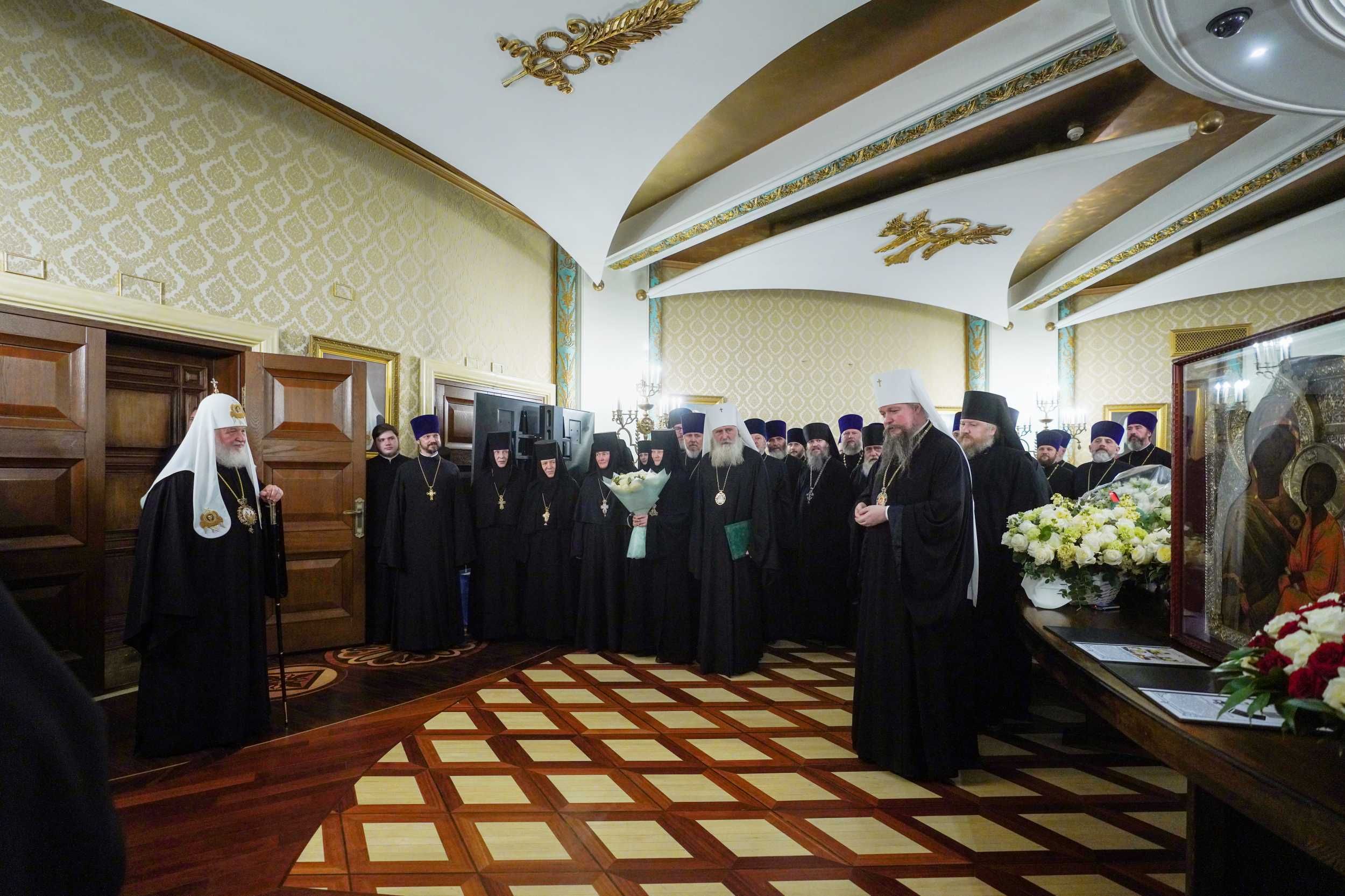 Затем в Сергиевском зале Храма Христа Спасителя Святейший Патриарх Московский и всея Руси Кирилл принял поздравления от архиереев и духовенства, принимавших участие в Литургии.