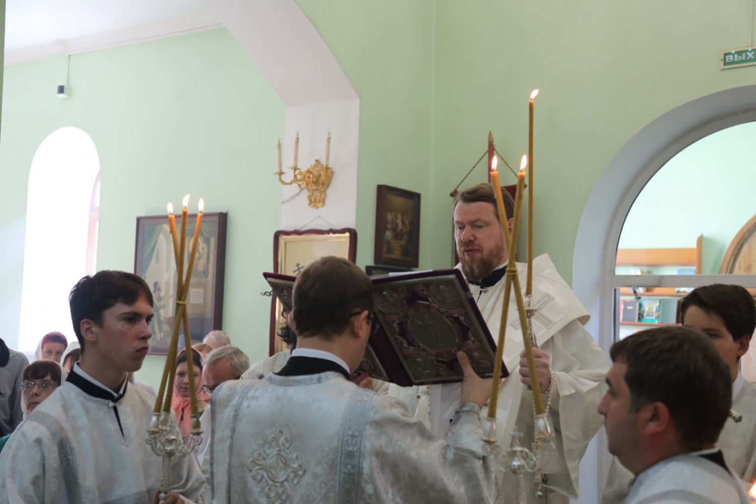 Его Высокопреосвященству сослужили: благочинный Уссурийского благочиния протоиерей Андрей Машанов, настоятель храма протоиерей Георгий Цуркан, настоятель храма Всех святых, во всем мире просиявших, при арсенале ракетного и артиллерийского вооружения Центра материально-технического обеспечения Восточного военного округа иерей Глеб Журавлев.