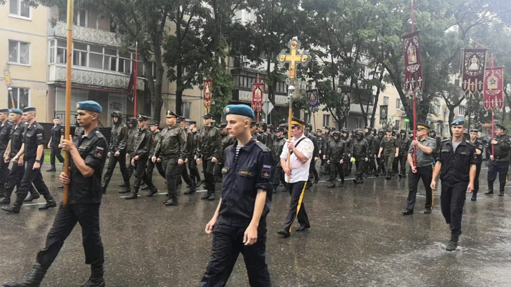 Колонна Крестного хода проследовала от Штаба 5 Краснознаменной ордена Жукова общевойсковой армии до храма святителя Николая Чудотворца, где состоялся мобелен у иконы Порт-Артурской Божьей Матери.