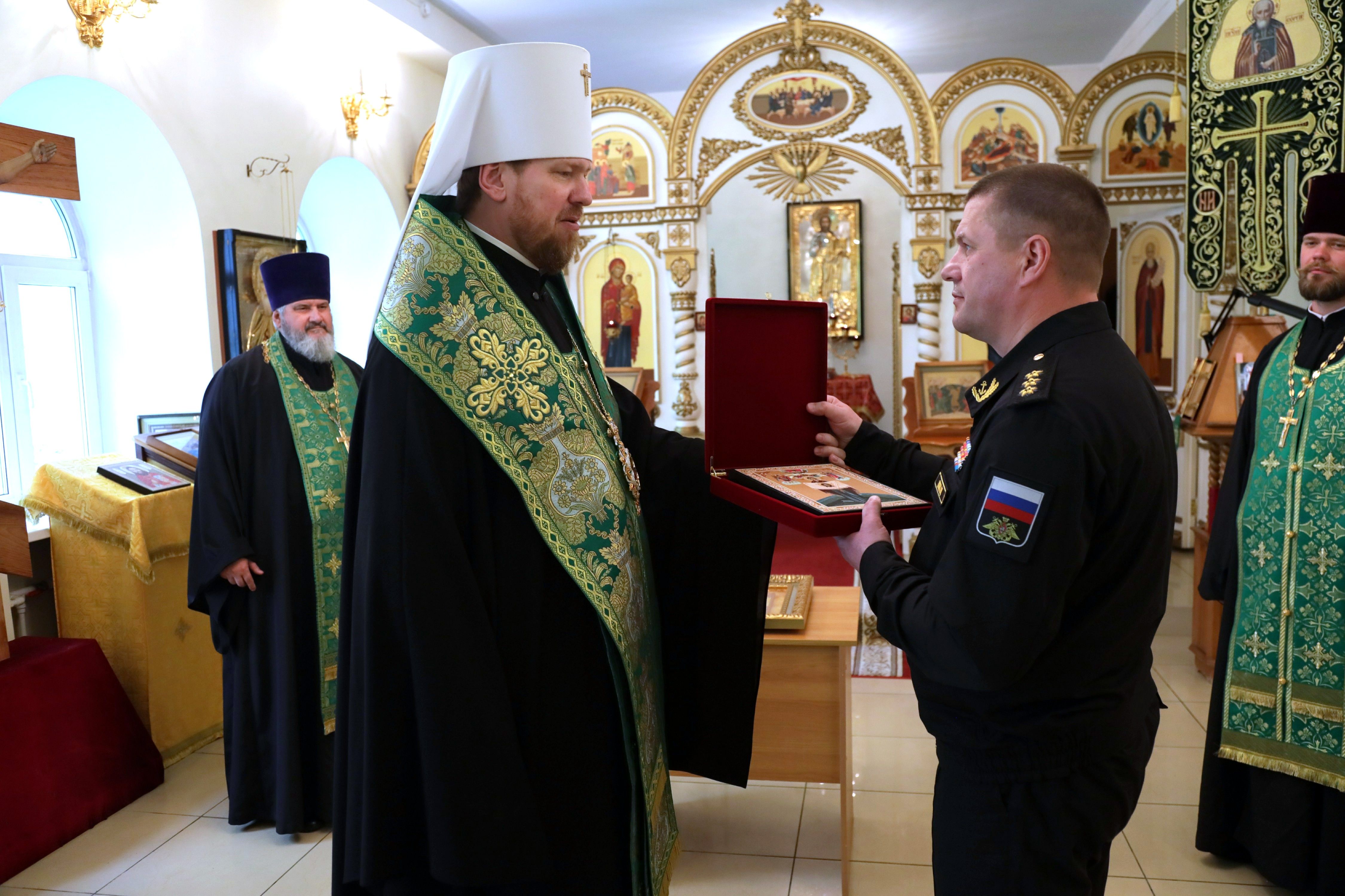 По завершении чина освящения владыка Владимир вручил командующему Тихоокеанским флотом образ особо почитаемой в Приморском крае Порт-Артурской иконы Торжества Пресвятой Богородицы.