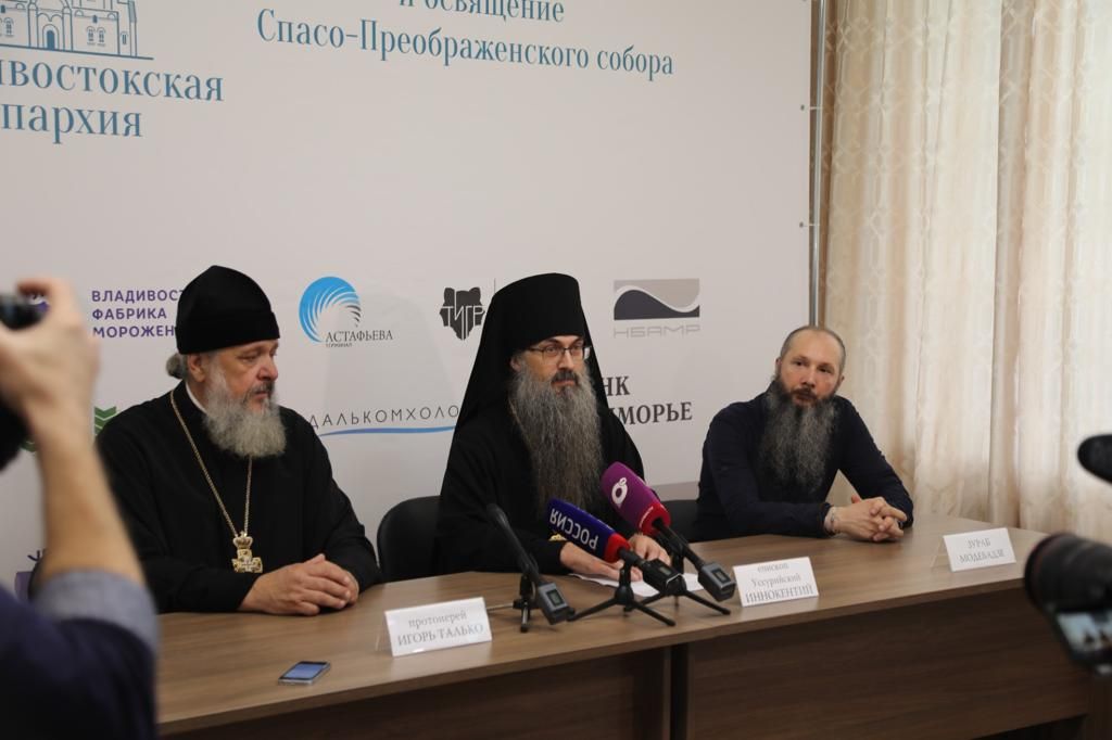 В ходе брифинга владыка Иннокентий рассказал об истории строительства собора, особо отметив роль ктиторов и всех жертвователей — православных верующих Приморья, внесших свою лепту в столь важное дело как созидание соборного храма.