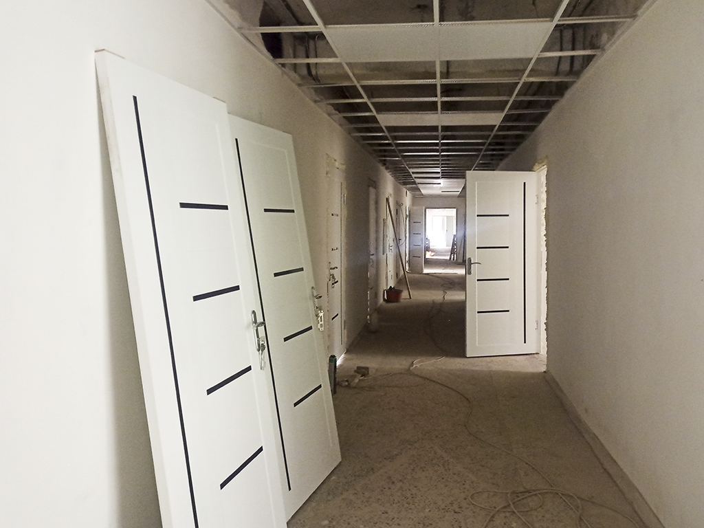 На первом этаже корпуса роддома завершена отделка стен, замена стеклопакетов, электросетей, систем отопления и водоснабжения, в коридоре уложен керамогранит, в душевых – кафель. Строители отремонтировали три крыльца, смонтировали пандус и каркас подвесного потолка. Устанавливают внутренние и внешние двери.