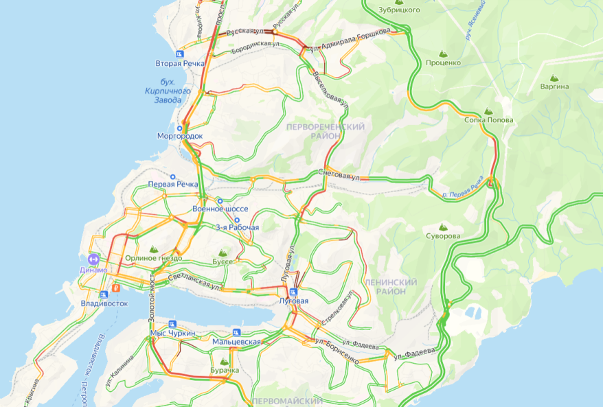 Традиционно наблюдаются заторы на участке от проспекта 100-летия Владивостока до Некрасовской, от Гоголя до Суханова, в районе площади Луговой, небольшой отрезок возле Казанской церкви, стоит улица Калинина - от Окатовой до Приморской Мариинки, также пробки на Нейбута, Воропаева, улице Русской и других.