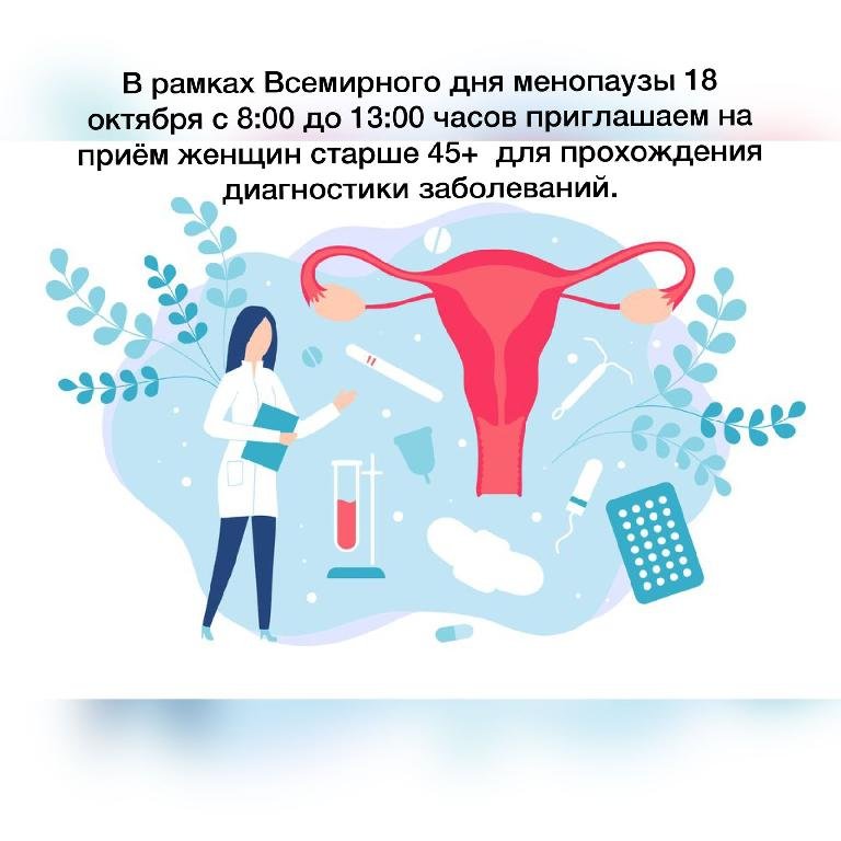 В рамках Всемирного дня менопаузы 18 октября с 8:00 до 13:00 часов приглашаем на приём женщин старше 45+ для прохождения диагностики заболеваний