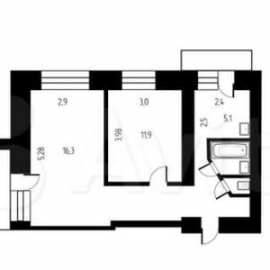 16,3-большая комната, 11,9-спальня, 5,1-кухня